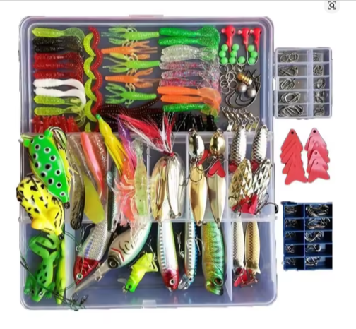 【Bionic Design】These fishing lures feature a precisely engineered shape, stereo 3D fisheye and lifelike scale patterns making the fish look more vivid and realistic, like a living fish in the water. Due to its genuine plating, the fishing spoons shows a brilliant flash in the water, and more reflective surfaces attract fish and make them strike. A perfect fishing bait that easily cheats the target fishes.【High-quality Material】 All fishing accessories made of stainless steel and soft plastic, which is not easy to defrom, and has anti-corrosion, durable and practical characters. All of these bass and trout fishing lures experienced precision processing, longer service life than other fishing bait. 【Easy to Carry】All fishing tackles are packed in a removable tray tackle box which is easy to carry and convenient to get the exact fishing tackles you need. It can easily fits in your fishing seat box, fishing backpack or fishing vest's pocket. 【Fishing Lures For Freshwater And Saltwater】The overall fishing baits kit suitable for saltwater and freshwater can meet the needs that catch bass, trout and other kinds of fish. Perfect for ocean boat fishing, ocean rock fishing, ocean beach fishing, lake, river, reservoir, pond and stream. 【Best Gift Choice】It's a perfect gift for mom or dad, son or daughter, husband or wife, boyfriend or girlfriend or yourself! Our fishing tackle kit are perfect and reliable choice for any angler and fishing enthusiast. Portable Tackle Box: The plastic fishing tackle box is free for you. All fishing tackles are packed in a compact box which is easy to carry, and convenient to get the exact fishing lures kit you need at anywhere, anytime. Features: 1.Material:Plastic & PVC & Metal 2.Color: Assorted 3.Model: 18PCS/56PCS/106PCS/109PCS/122PCS/164PCS/234PCS/320PCS 4.Position: ocean boat fishing, ocean rock fishing, ocean beach fishing, lake, river, reservion, pond and stream 5.Different set contains different baits